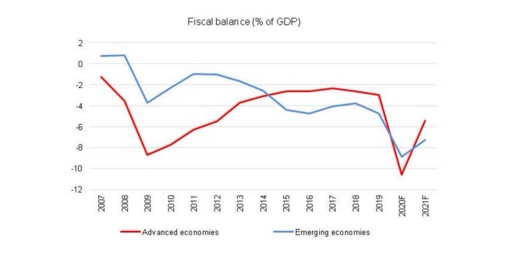 不仅宽松的货币政策以前所未有的力度实施,今天的财政扩张也远远超过2008/2009年大萧条时期的水平。下表显示,与2008/2009年相比,发达经济体和新兴经济体的财政赤字占GDP的比例预计将更大,而新兴市场经济体的财政赤字将增加一倍以上。