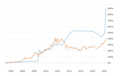 此外,下一张图表显示,在2020年,金价的变化没有跟上美联储(FED)大幅提高资产负债表扩张的步伐。如2004-2019年的图表所示,金价变动与美联储资产负债表规模变动之间存在大致的对应关系。随着时间的推移,从逻辑上讲,预计金价最终将进一步上涨,至少更能反映美联储(FED)资产负债表扩张以及其他主要发达经济体央行资产负债表的普遍扩张。