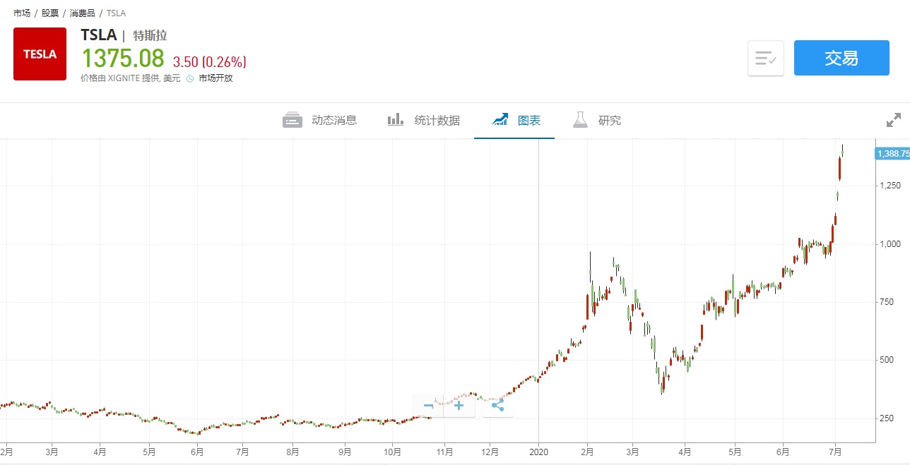 智通财经APP获悉,7月7日(周二)美股开盘,特斯拉(TSLA.US)涨3.36%,截至北京时间21:36,报1417.73美元。