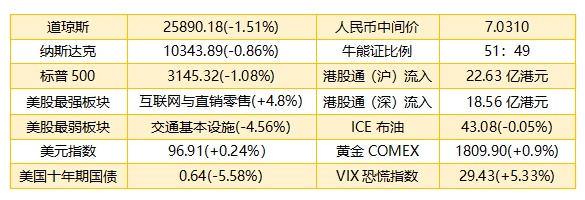 1、美国卫生事件再度恶化,刺激投资者避险情绪升温,拖累美股下跌。道指全日震荡走低,盘中失守26000点关口,全日收跌1.51%;纳指收跌0.86%,盘中一度刷新历史高位;标普500指数收跌1.08%。周二美股回落,港股ADR指数全日受压,按比例计算,收报25904点,跌70.54点。
