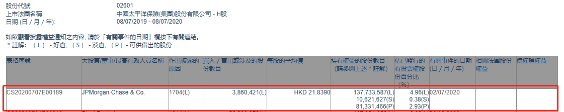 智通财经APP获悉,香港联交所最新资料显示,7月2日,摩根大通减持中国太保(02601)约386.04万股,每股作价21.839港元,总金额约为8430.73万港元。智通财经APP获悉,减持后最新持股数目为1.38亿股,最新持股比例为4.96%。