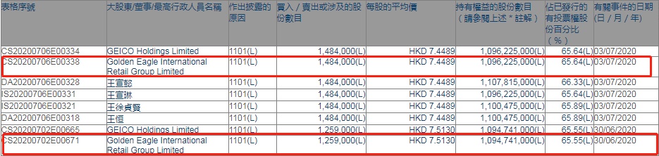 智通财经APP获悉,香港联交所最新资料显示,6月30日及7月3日,Golden Eagle International Retail分别增持金鹰商贸(03308)125.9万股和148.4万,每股作价分别为7.5130港元和7.4489港元,总金额约为2051.3万港元。智通财经APP获悉,增持后最新持股数目为10.96亿股,最新持股比例为65.64%。