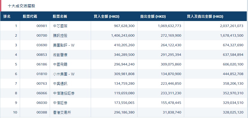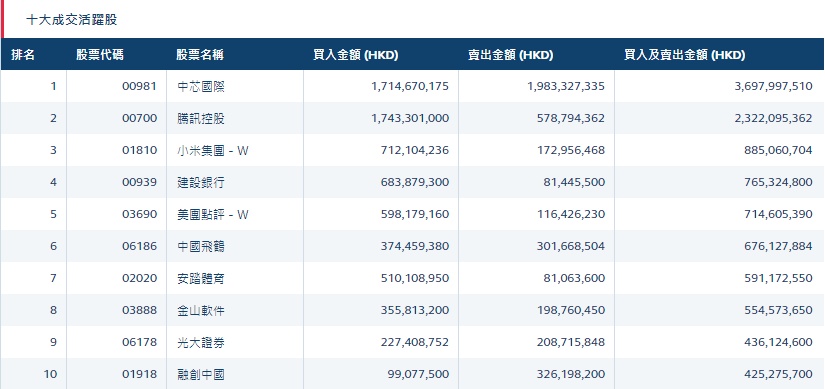 此外,微创医疗(00853)获净买入5499万,而中芯国际(00981)、中兴通讯(00763)分别遭净卖出3.7亿、8868万港元。