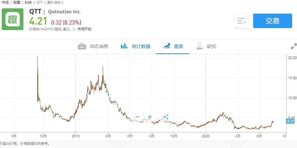 智通财经APP获悉,7月8日(周三)美股开盘,趣头条(QTT.US)股价拉升,截至21:39,该股涨8.23%,报4.21美元。