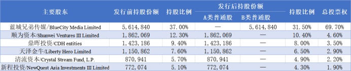 此次蓝城兄弟完成IPO后,公司创始人兼CEO耿乐持有33%股权,并拥有70.7%的投票权;机构投资者中,顺为资本持有公司10.4%股权、4.6%投票权;鼎晖投资有8%股权,拥有3.5%投票权。
