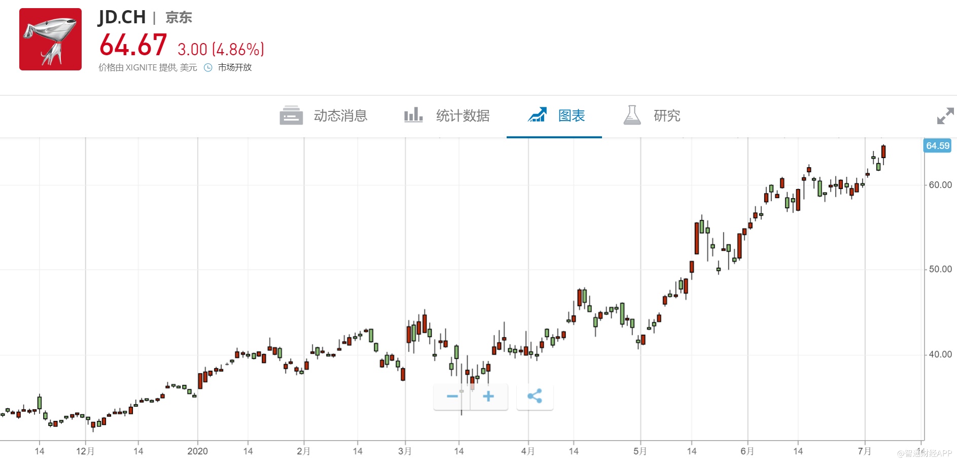 智通财经APP获悉,周三美股盘初,京东(JD.US)股价拉涨,触及历史新高的64.79美元。截至北京时间22:42,该股涨4.86%,报64.67美元。
