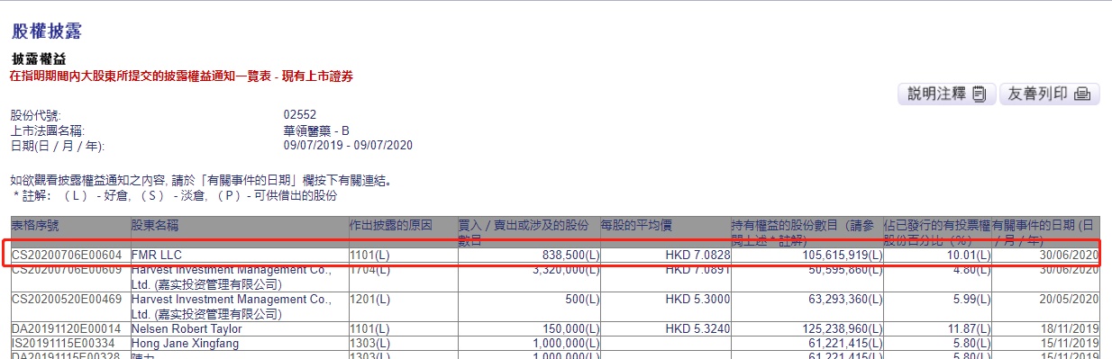 智通财经APP获悉,联交所最新资料显示,6月30日,FMR LLC增持华领医药-B(02552)83.85万股,每股作价7.0828港元,涉及总金额约为593.89万港元。增持后最新持股数目约为1.06亿股,最新持股比例10.01%。