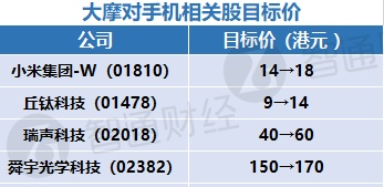 大摩指出,小米第二财季盈利或已是低点,将小米集团-W目标价由14港元上调28.57%至18港元;丘钛科技(01478)目标价由9港元上调55.55%至14港元;瑞声科技(02018)目标价由40元上调50%至60港元;舜宇光学科技(02382)转向客户多元化的举措正在取得成效,公司豪华车镜头业务回暖,有望快于汽车整体恢复步伐,将其目标价由150港元上调13.33%至170港元。
