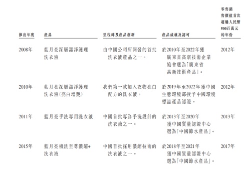在2000年、2008年及2015年,蓝月亮战略性地推出洗手液、洗衣液及浓缩洗衣液产品,且均迅速打入市场,并长达十余年经久不衰,销售量仍在持续增长中。在2017年至2019 年,蓝月亮深层清洁护理(亮白增艳)洗衣液、蓝月亮深层洁净洗衣液、柔顺剂及抑菌洗手液的收益复合年增长率均超过10%。
