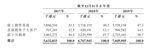 招股书数据显示,蓝月亮线上渠道收益的复合年增长率为33.5%。截至2019年12月31日止,蓝月亮线上销售渠道所产生的收益为33亿港元,占总收益的47.2%。而同期中国家庭清洁护理行业线上销售渠道零售额的复合年增长率为8.5%。蓝月亮的年复合增长率远远超出行业平均水平。