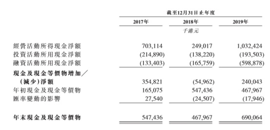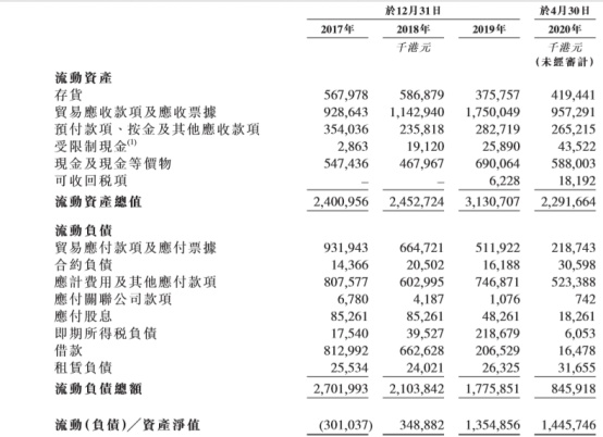 再看蓝月亮的现金流量以及资产负债净值,其2017年至2019年年末现金及现金等价物从5.47亿港元上升至6.90亿港元;流动资产净值由-3.01亿港元上升至13.55亿港元,截至2020年4月30日,其流动资产净值为14.46亿港元。