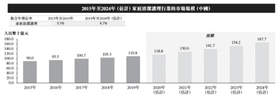 根据弗若斯特沙利文报告,中国家庭清洁护理行业的零售销售总价值由2015年的900亿元增至2019年的1108亿元,复合年增长率为5.3%,增长速度高于同期全球家庭清洁护理行业2.5%的复合年增长率。此外,该报告预期中国家庭清洁护理行业的零售销售总价值有望继续增长,至2024年将达到1677亿元,2019年至2024年复合年增长率为8.7%。