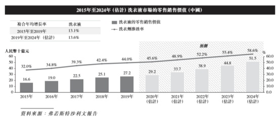 弗若斯特沙利文报告指出,到2024年,洗衣液在中国市场的渗透率将达到58.6%,而预计自2019年起,洗衣液零售销售总价值将以13.6%的复合年增长率增长,到2024年将达到515亿元。