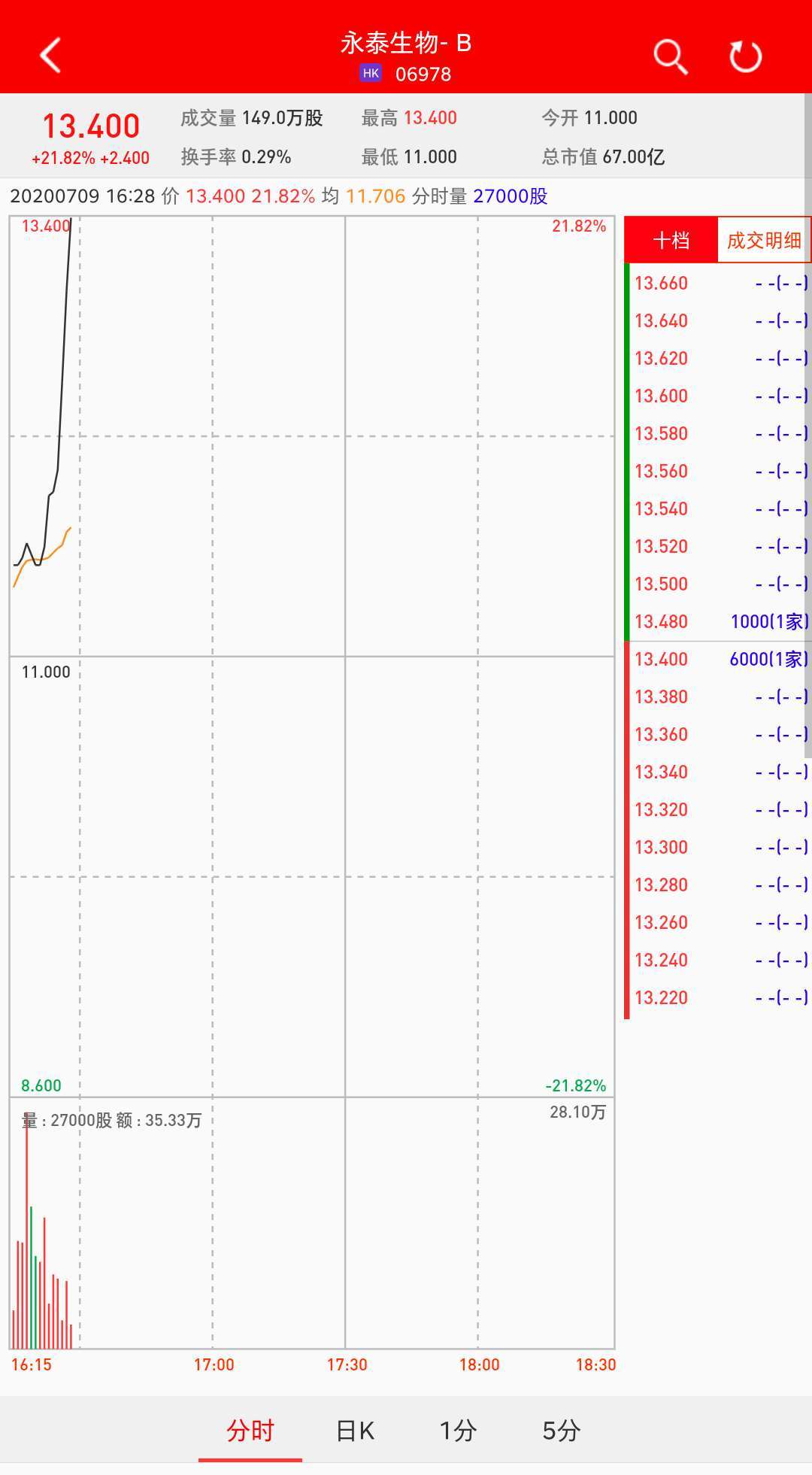 智通财经APP获悉,永泰生物-B(06978)将于7月10日挂牌,今日暗盘开盘高开,截止发稿,利弗莫尔证券资料显示其暗盘报价13.40港元,较招股价11.0港元上涨21.82%。每手1000股,不计手续费,每手赚2400港元。