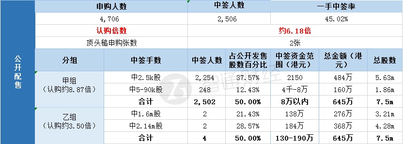 其中,公开配售申购人数4706人,一手中签率45.02%,认购倍数约6.18倍。