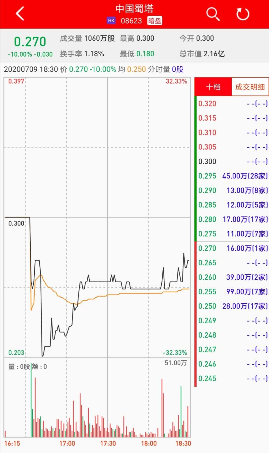 智通财经APP获悉,中国蜀塔(08623)将于7月10日挂牌,截至暗盘收盘,利弗莫尔证券资料显示中国蜀塔暗盘报价0.27港元,较招股价0.3港元跌10%。每手10000股,不计手续费,每手亏300港元。