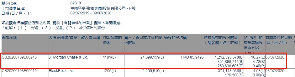 智通财经APP获悉,联交所最新资料显示,7月6日,小摩增持中国平安(02318)约2439.9万股,每股作价85.9495港元,总金额约为20.97亿港元。增持后最新持股数目约为12.12亿股,最新持股比例为16.27%。