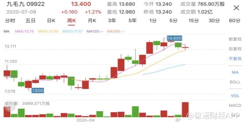 尽管九毛九曾在5月12日发布公告称,公司为节省各项成本开支,决定关闭客流量较少的门店以及停止在北京、天津及武汉经营九毛九餐厅,投资者依然不愿意把“便宜”留给别人。九毛九股价在5月上涨15.3%,6月续涨6.25%。