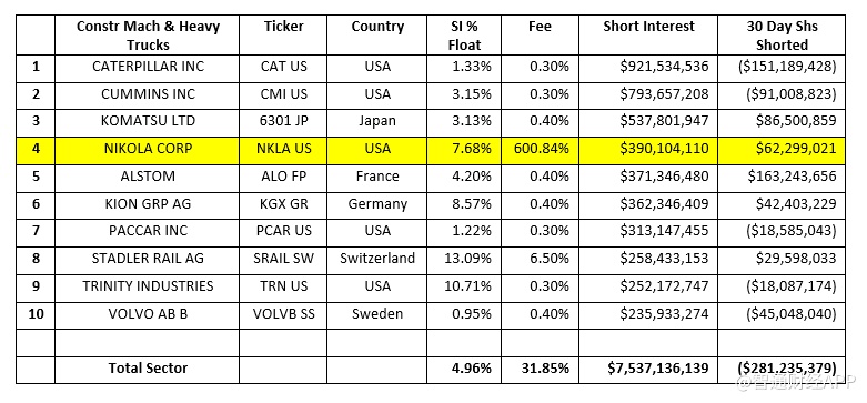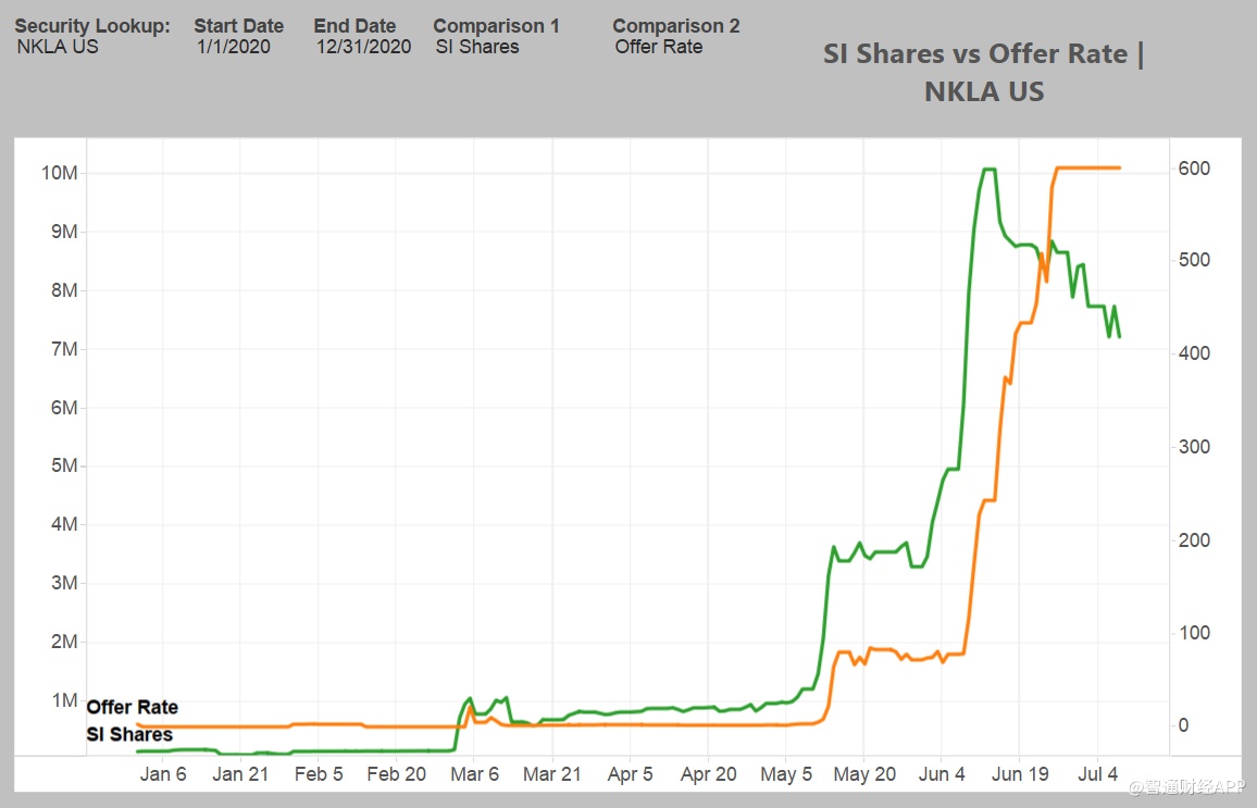 对于Nikola的空头,股票借贷费用已经暴涨,并且已经达到了未平仓空头头寸费用的600%,新股借贷费用在850%-950%之间。