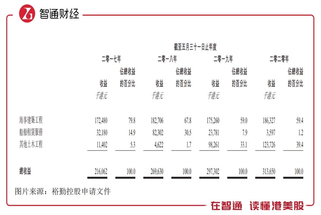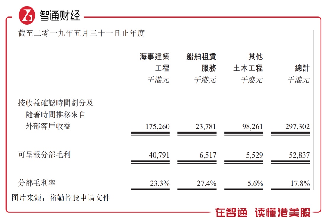 裕勤控股主要在香港从事经营活动,从行业上看并不乐观,根据其申请文件,香港香港海事建筑工程土木工程行业基本处于负增长状态,2019年,香港土木工程产值514亿港元,近五年复合增长率分别为-3%,而海事建筑工程也为负增长,预期未来五年年复合增长率- 1.5%。此外,香港船舶租赁行业近五年也仅1.4%的复合增长率。