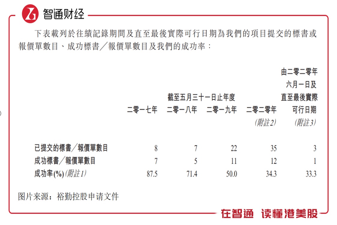 不过该公司投标成功率呈逐年走低的趋势,2020财年成功率仅为34.2%,而2017财年则高达87.5%。香港行业集中度相对较高,于2018年前五大市场份额35.4%,而该公司市场份额仅为1.1%,市场竞争力较弱,而且该公司收入集中度很高,若被竞争对手“挖墙脚”,对业绩影响还是比较大的。