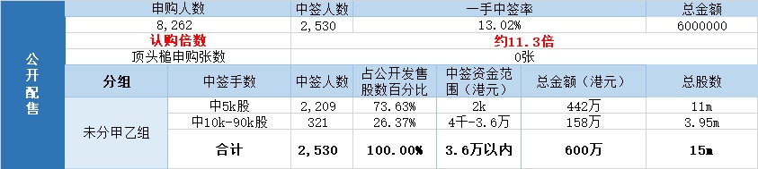 其中,公开配售申购人数8262名,一手中签率13.02%,认购倍数约11.3倍。