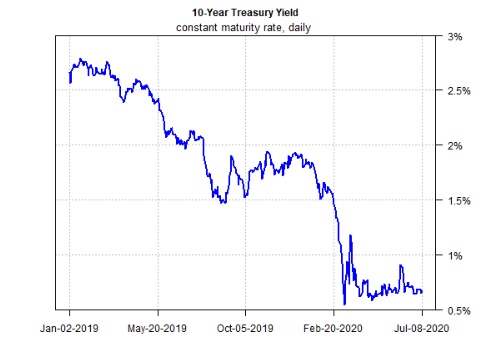 在形式上,美联储并没有瞄准国债收益率,不过最近10年期国债收益率的持平表明,情况并非如此。除了少数例外情况,10年期国债收益率自4月份以来一直异常稳定,在0.6%-0.7%的窄幅区间内徘徊,只有一次短暂飙升至0.91%。