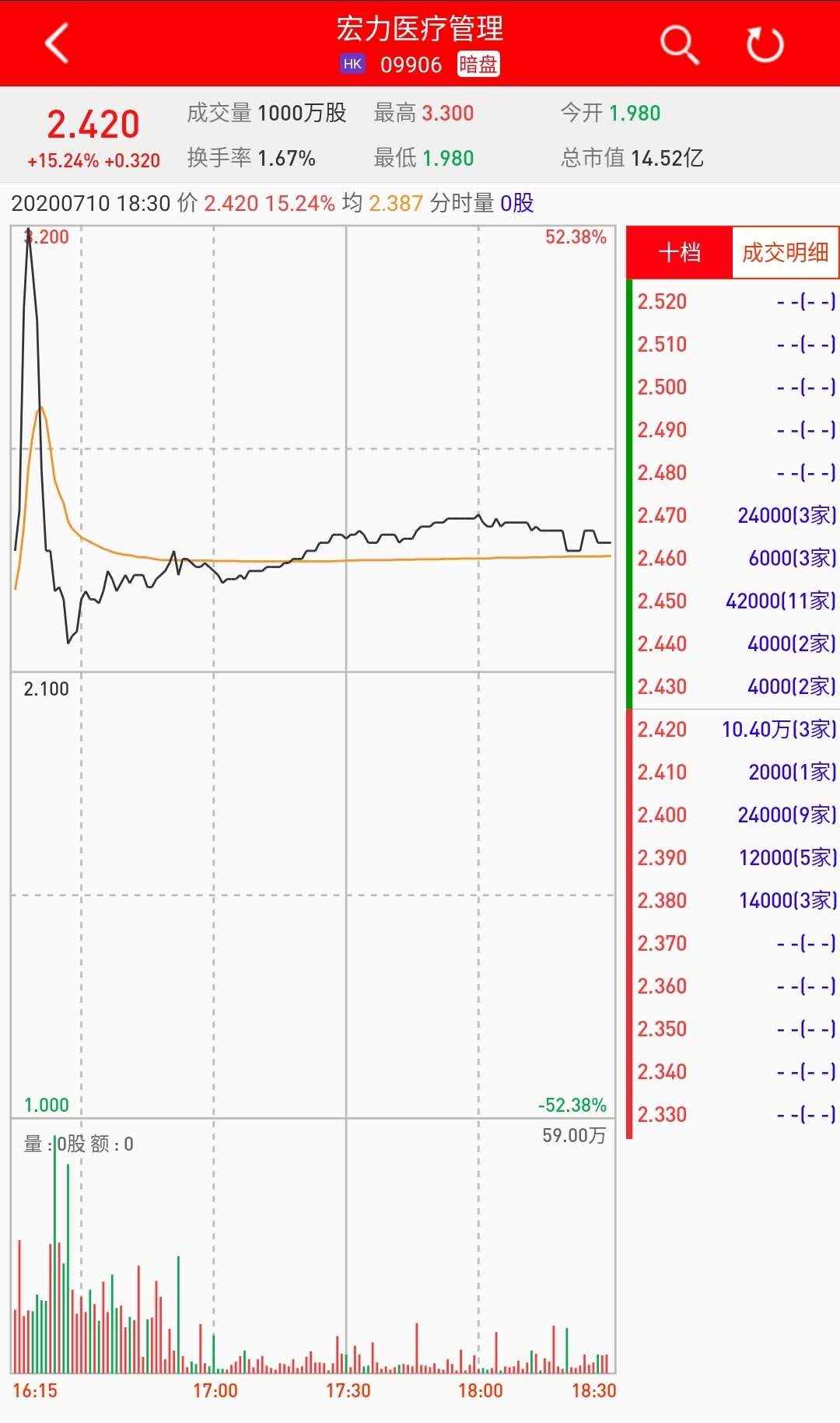 智通财经APP获悉,宏力医疗管理(09906)将于7月13日挂牌,截至暗盘收盘,利弗莫尔证券资料显示其暗盘报价2.42港元,较招股价2.1港元涨15.24%。每手2000股,不计手续费,每手赚640港元。