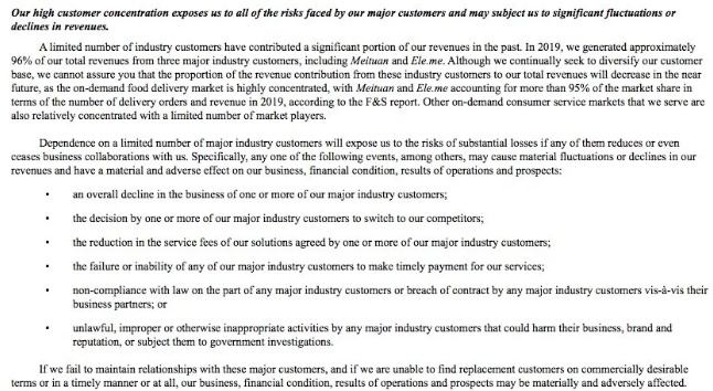 此外,还需要特别注意的是,趣活的客户高度集中,过度依赖美团和饿了么。其在招股书中披露,2019年,公司从三大行业客户(包括美团和饿了么)产生了约96%的总收入。