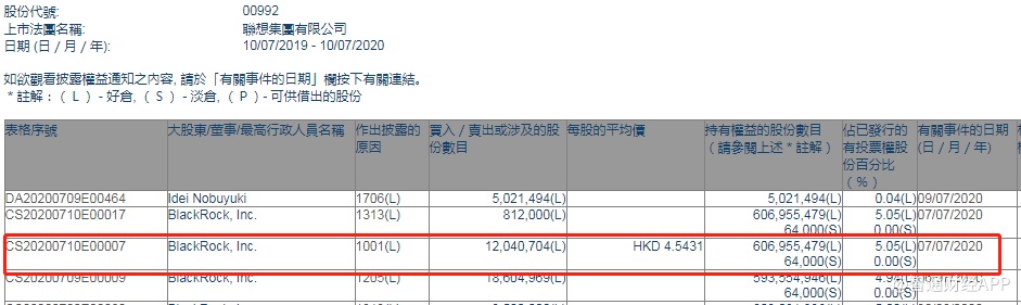 智通财经APP获悉,联交所最新资料显示,7月7日,贝莱德增持联想集团(00992)1204.07万股,每股作价4.5431港元,总金额约为5470.21万港元。增持后最新持股数目约为6.07亿股,最新持股比例为5.05%。