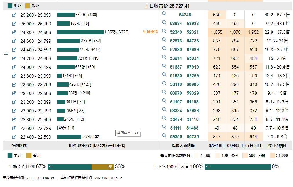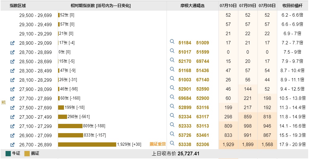 智通财经APP获悉,截至7月9日,恒指最新的牛熊街货比例67:33。摩根恒指牛熊证街货分布图中的数据显示,熊证街货重货区在26700-26899区间,该区间最新熊证数量为1929张,较上一交易日增加30张,最多新增也在该区间。牛证街货重货区在24800-24999区间,该区间最新牛证数量为1655张,较上一交易日减少233张,最多新增区间在25200-25399区间,较上一交易日增加630