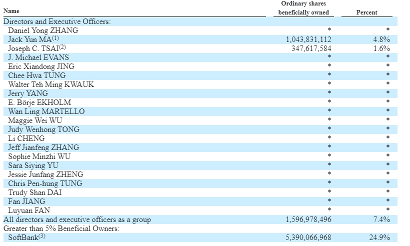 智通财经APP获悉,阿里巴巴(09988,BABA.US)于北京时间7月10日凌晨向SEC提交的报告显示,截至2020年7月2日,创始人马云持股降至4.8%,蔡崇信持股降至1.6%,软银所持股份比例降至24.9%,但仍为阿里巴巴的最大股东。