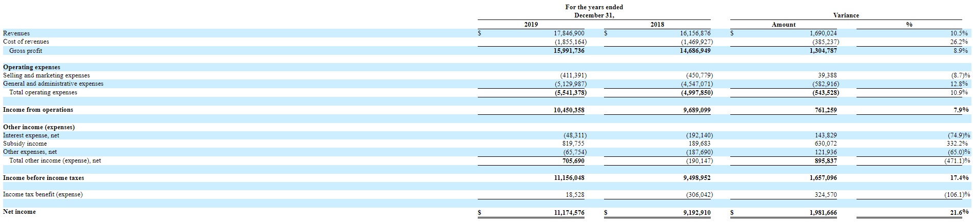 截止2019年12月31日,公司营收为1784.69万美元,同比增长10.5%;毛利为1599.17万美元,同比增长8.9%;净利润为1117.46万美元,同比增长21.6%;每股收益0.55美元,2018年同期为0.46美元。