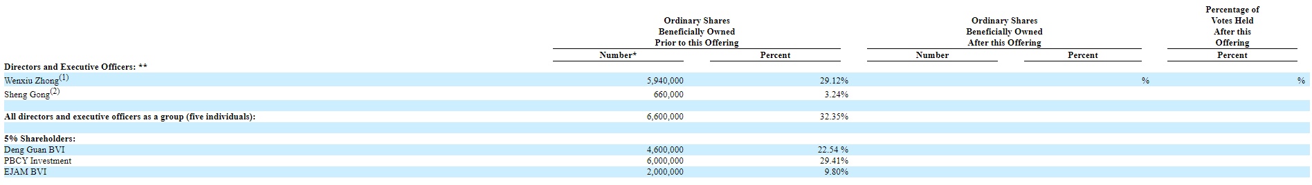 公司创始人及CEOWenxiu Zhong此次发行前持股29.12%; 营销总监Sheng Gong此次发行前持股3.24%; 公司高管及领导层(共五人)持股比共计32.35%。