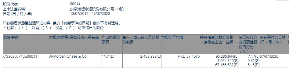 智通财经APP获悉,联交所最新资料显示,7月7日,小摩增持海螺水泥(00914)245.3938万股,每股作价57.4075港元,总金额约为1.41亿港元。增持后最新持股数目约为9328.39万股,最新持股比例为7.17%。