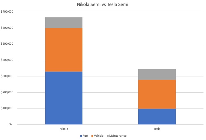 通过一个简单的图表上,就会得出一个非常鲜明的对比。正如特斯拉semi的低成本所表现的那样。特斯拉的续航里程为500英里的纯电动卡车售价为18万美元,相比之下,Nikola氢燃料电池卡车售价为26.8782万美元。