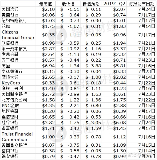 近期将进入历史上银行股最重要的财报季,但分析师们对于该行业盈利和股息的预期仍存在不确定性。如下表,大多数银行分析师对预期毫无头绪,第二季度每股收益预期高低值差很大。