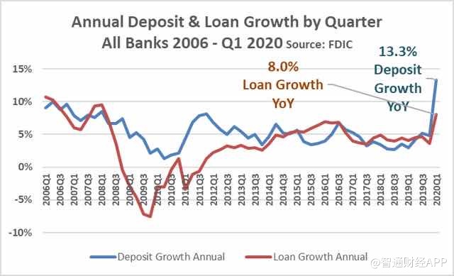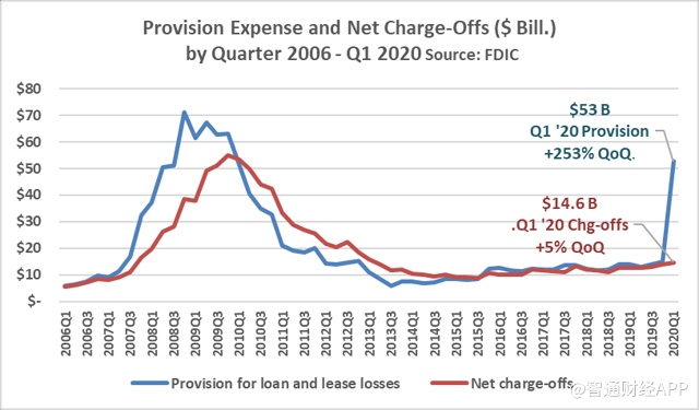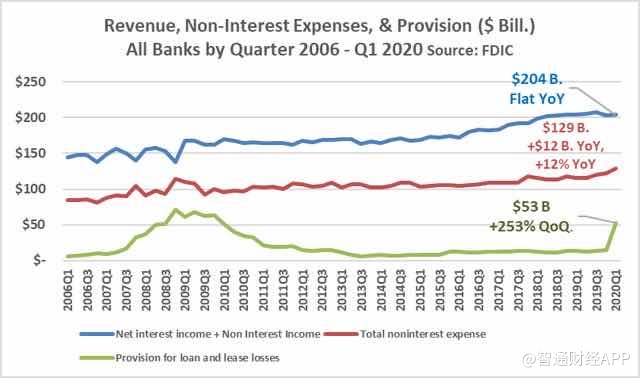 值得注意的是,2020年一季度银行的计提准备金为530亿美元,高于2019年四季度的150亿美元。今年一季度银行拨备因引入CECL(即当前预期信用损失模型)而受到拖累,CECL是确定充足贷款或租赁损失准备金的新会计准则。