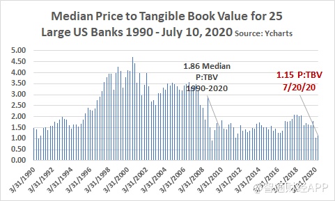 智通财经APP获悉,2020年7月美国银行业估值处于30年低位。银行业目前的低股价有形账面值比(Price to Tangible Book Value)是长期投资者持有优质银行股的有力理由。下图显示了1990年至2020年7月10日美国25家大型银行股价有形账面值比(PTBV)的中位数变化。