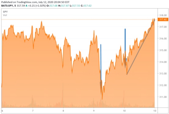 Lerner认为尽管希望美股不要崩溃,当看到市场参与者在每次大盘小幅回调就蜂拥而入时,我们不得不引起警惕。目前指数正处于上端徘徊,这波涨势存在回调的可能。下图为标普500指数ETF上周五个交易日的分时图,蓝色标记部分为上周四和上周五的走势。