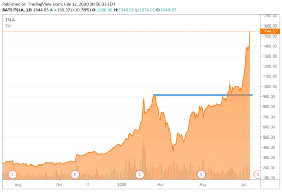 下图可以看出,该公司股价的支撑位在900美元甚至是1000美元左右,较目前水平低30%。如果特斯拉没有被纳入标普500指数,将会对牛市造成负面影响。无论如何,该公司都可能是指数上涨或下调的催化剂。