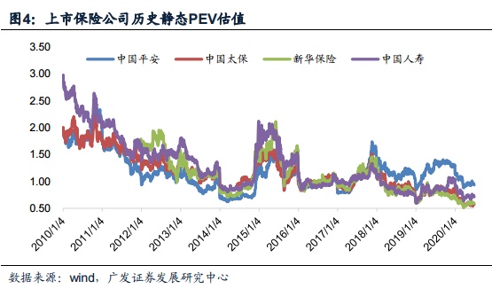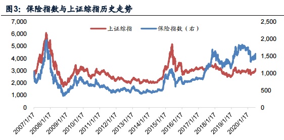 复盘保险股,市场上涨均会带动保险股实现超额收益。如2009年上证综指涨幅 80%(区间涨幅,下同),而保险指数涨幅106%,实现超额收益26%(上市险企PEV 估值平均值由1.67X提升至2.65X);2014全年上证综指涨幅53%,而保险指数涨幅 85%,实现超额收益32%(上市险企PEV估值由1.13X以下提升至1.76X)2019年一 季度市场大涨,上证综指涨幅31%,而保险股涨幅53%,实现超额收益22%。