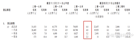 2019年,汽油、柴油和煤油的毛利率分别为4.8%、3.2%和2.2%,成品油总体的毛利率为4.4%,由此可见毛利率并不高。而且,其业绩增长受到下游行业影响十分明显。由于其产品主要为成品油,即石油、柴油和煤油,该类产品主要用于汽车、航运等,下游需求不振便很快传导至公司。今年受公共卫生事件影响,其成品油毛利率降为只有1.1%。