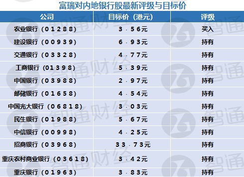 四、富瑞对内地银行股最新评级与目标价