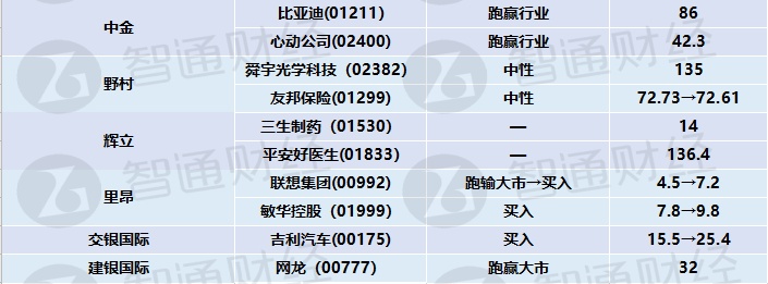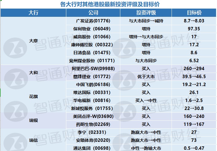 五、 各大行对其他港股最新投资评级及目标价
