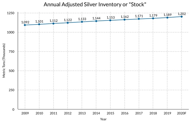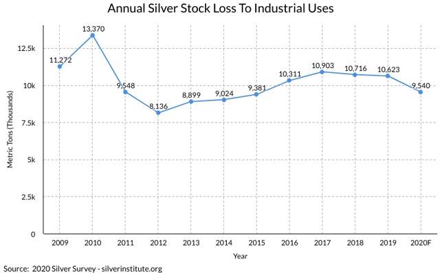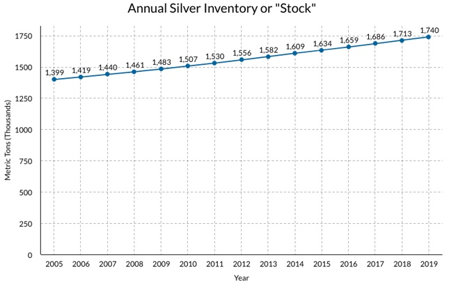 上述存量是基于已开采的白银总量。每年有很大一部分白银用于工业用途。将每年用于工业用途的银量与每年回收的银量进行比较,在过去的十年中,每年因工业用途而损失的银量平均约为每年开采量的44%。