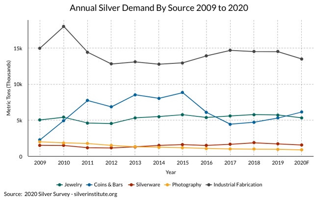 虽然白银仍然具有作为价值储存手段的特性,但它具有的其他特性也创造了对这种金属的工业需求。因此,每年都有一部分白银没有被制成银条存放在金库中,而是被用于制造电子产品、电池,以及其他工业用途。