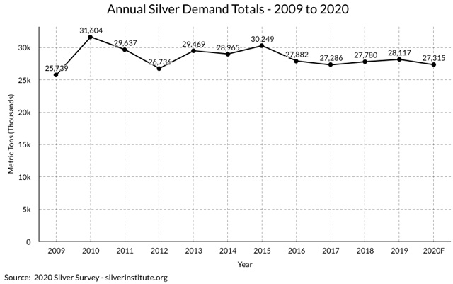 由于公共卫生事件和经济疲软,预计2020年白银需求将小幅下降。