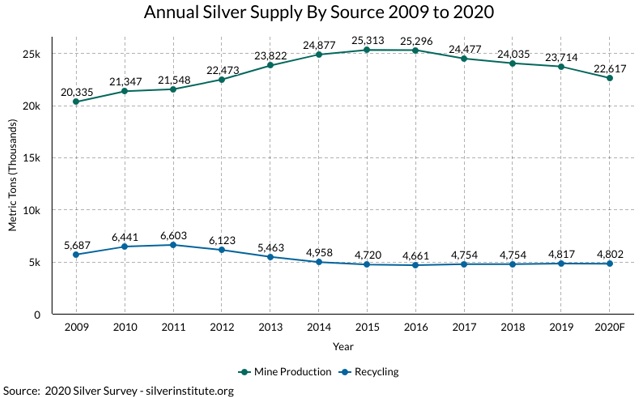 下图中的绿线表示全世界每年开采量,蓝线表示每年回收的银量。只有从矿中开采出来的白银量才被认为是白银的“流量”。