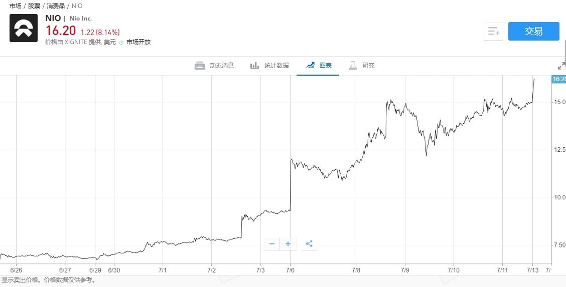智通财经APP获悉,今日(7月13日)美股盘初,蔚来(NIO.US)股价高开高走一举突破16美元,创下纪录新高16.44美元,截至北京时间21:41,涨8.14%,报16.2美元。